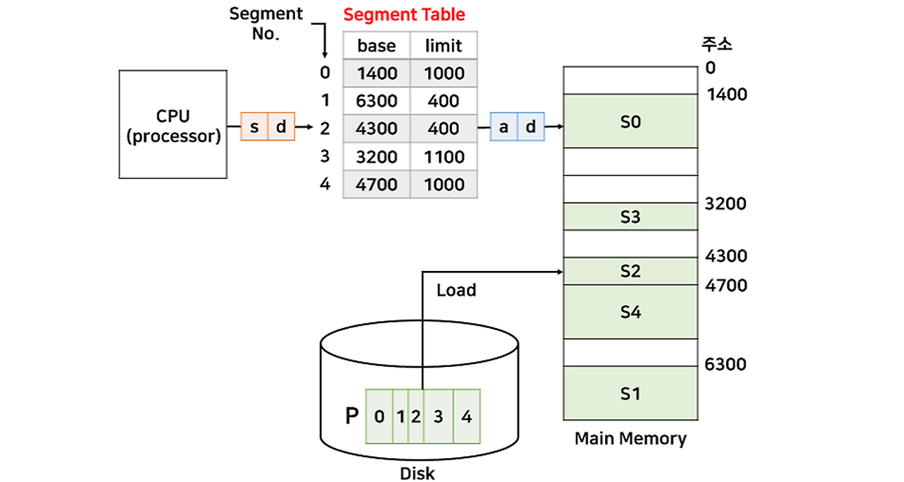 세그먼트 테이블의 각 엔트리의 논리 주소는 <segment-number, offset>으로 구성된다. 페이징과 달리, 세그먼트의 크기는 일정하지 않기 때문에 테이블에 limit 정보가 추가로 담겨 있다. 만약 세그먼트의 범위를 초과하는 주소가 들어온다면, 인터럽트가 발생해 프로세스가 강제로 종료된다.